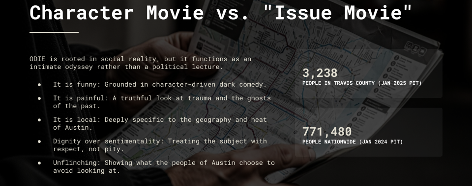 Austin is a city people love to promote. It’s clean, creative, fast-growing. But there’s another version of the city that lives just beneath that surface. It exists in the medians, underpasses, bus stops, and sidewalks most people pass through without stopping. Odie is built to stay there for a full day and let the audience sit with it.